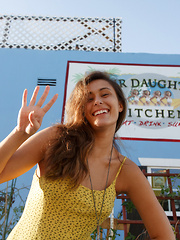 This lovely brunette babe loves to flash her shaved pussy and to share her flawless teen body with us in public places.