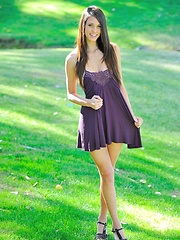 Newcomer Lucie strips outdoors baring her sweet tits and trimmed pussy.